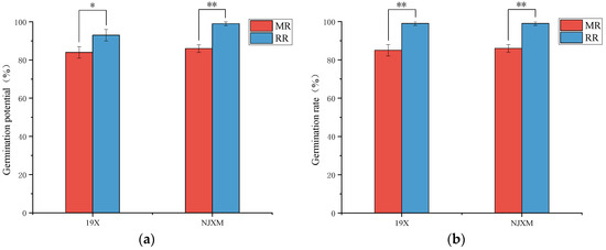 Comparison of (a) germination potential and (b) germination rate between main rice (MR, red bars) and ratoon rice (RR, blue bars) for two varieties: 19X and NJXM. “*” indicated p < 0.05, “**” indicated p < 0.01.