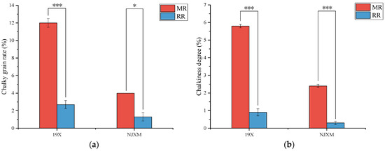 Comparison of (a) chalky grain rate and (b) chalkiness degree between main rice (MR, red bars) and ratoon rice (RR, blue bars) for two varieties: 19X and NJXM. “*” indicated p < 0.05, “***” indicated p < 0.001.
