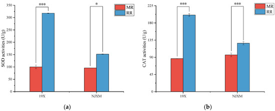 Comparison of (a) SOD activity and (b) CAT activity between main rice (MR, red bars) and ratoon rice (RR, blue bars) for two varieties: 19X and NJXM. “*” indicated p < 0.05, “***” indicated p < 0.001.