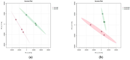 Comparison of differential gene expression between main rice and ratoon rice. (a) PCA plot of 19X main rice and ratoon rice; (b) PCA plot of NJXM main rice and ratoon rice. PC1 and PC2 represent the first and second principal components, respectively. Each scatter point stands for an individual sample. The plots revealed substantial differences in gene expression between the main rice and ratoon rice of both 19X (left plot) and NJXM (right plot) varieties, as samples of different rice types (distinguished by colors) showed clear separation along the PC1–PC2 axes.