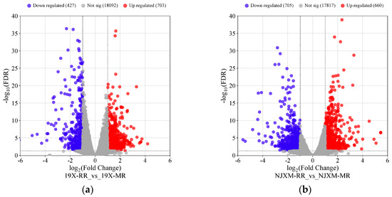 Principal Component Analysis (PCA), a statistical method for analyzing multi-dimensional data in unsupervised pattern recognition, was employed to assess the overall differences in gene expression between main rice and ratoon rice. The PCA results for the two groups of samples are shown in Figure 4a,b, where PC1 and PC2 denote the first and second principal components, respectively. Each scatter point represents an individual sample, revealing substantial differences in gene expression between the main rice and ratoon rice of both 19X and NJXM varieties. To screen for genes with significantly differential expression, thresholds of fold change (FC) ≥ 2.0 or ≤0.5 and false discovery rate (FDR) < 0.05 were applied [25] (FDR refers to the false discovery rate after multiple hypothesis testing correction for p-values.).