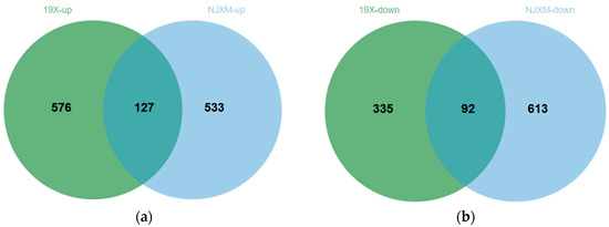 Intersection of differentially expressed genes (DEGs) in ratoon rice between varieties 19X and NJXM. (a) Upregulated DEGs. The Venn diagram shows 576 upregulated gene expressions for 19X, 533 for NJXM, and 127 shared by both varieties. (b) Downregulated DEGs. The Venn diagram shows 335 downregulated gene expressions for 19X, 613 for NJXM, and 92 shared by both varieties.