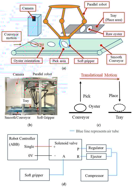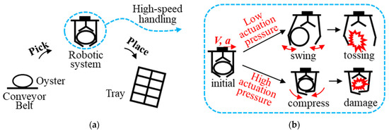 Aquatic products are essential for meeting global food demand [1]. Oysters are an important category of aquatic products, offering high nutritional value with comparatively low environmental impact [2,3]. Global oyster farming yields 7.1 million tons [4]. Japan is one of the main oyster producers, with production areas such as Hiroshima and Miyagi Prefectures [5,6]. Raw oysters are regarded as a premium product [7]. The processing of such fresh products includes peeling, cleaning, grading, and packaging, as they are highly perishable after harvest [8]. Pick-and-place handling during packaging directly influences product uniformity and production efficiency [9]. Currently, the handling of raw oysters remains largely manual [10]. Workers pick raw oysters from conveyor belts and place them into plastic trays [11]. Due to the wet, slippery surface and soft, fragile tissue, workers handle raw oysters gently and carefully to preserve their integrity [12].