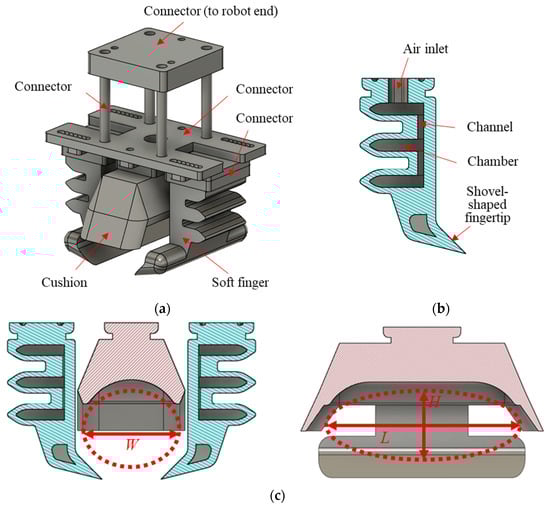 Soft robotic gripper: (a) 3D schematic of the soft gripper; (b) the section view of soft finger shows the air channels and chambers; (c) a containing space in the soft gripper for grasping raw oysters with a size of L81.45 mm × W43.00 mm × H33.35 mm.