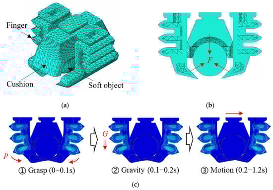 The simulations were conducted in three steps, as shown in Figure 5c: applying an actuation pressure on the inner surfaces of the air chambers to grasp the object, applying a 1 g “gravity” load to the entire model, and applying motion parameters to the top surfaces of the fingers and the cushion.