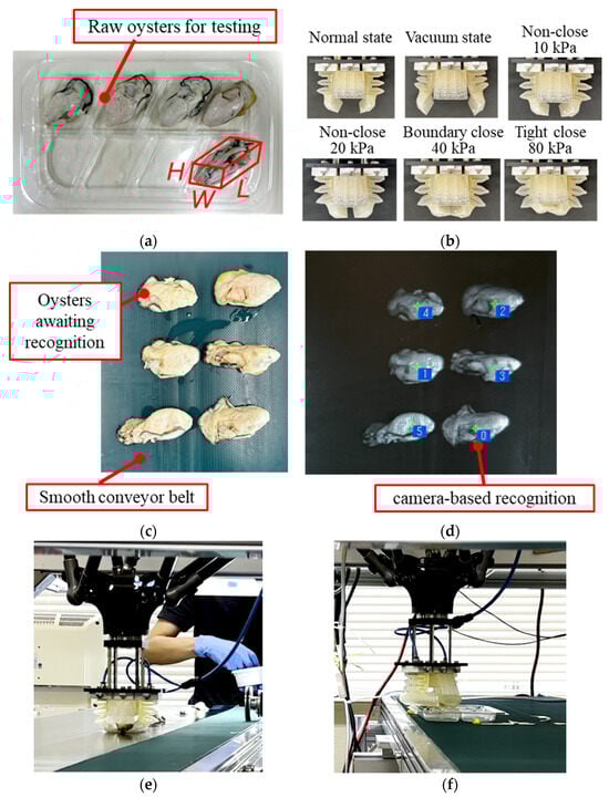 Tested raw oysters and experimental snapshots: (a) the raw oysters weighed 13.00 ± 1.05 g with an average size of L56.73 ± 3.96 mm × W26.19 ± 1.75 mm × H17.33 ± 1.54 mm; (b) different gripper states; (c) raw oysters on the conveyor belt are waiting for recognition; (d) the camera-based recognition of raw oysters; (e) gripper grasping an oyster from the conveyor belt; (f) gripper placing an oyster into the tray.