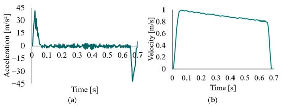Illustration of translational motion during pick-and-place handling: (a) measured data of the robot end acceleration during translational motion; (b) velocity data are obtained by integrating the raw acceleration data.
