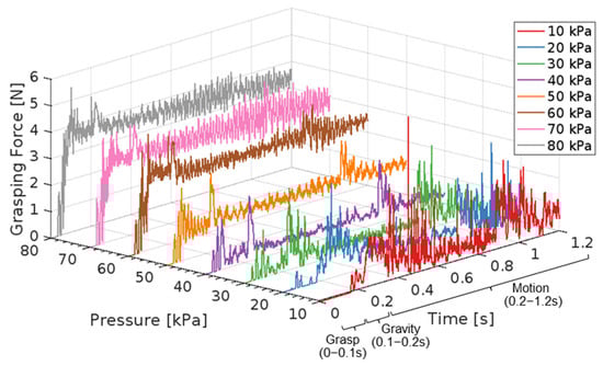 Results of grasping forces indicate that neither overly low nor overly high actuation pressures suit the high-speed handling of soft objects. Moderate pressures provide the better compromise between peak and average grasping forces, which achieve stable grasping while protecting the object. Section 3.2.3 identifies an optimal actuation pressure for the soft gripper.