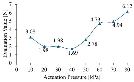 Calculated by Equation (2) with grasping forces from FEA in Section 3.2.2, the evaluation results of optimal actuation pressure in Figure 10 show that Λ ranges from 1.69 N to 6.12 N, indicating an optimal actuation pressure exists.