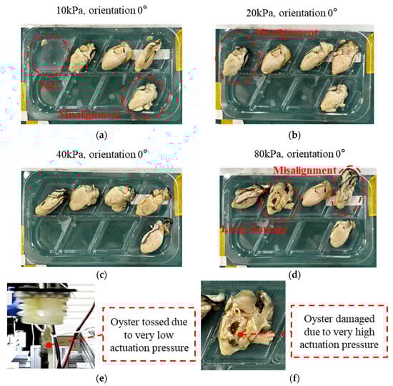 Results of actuation pressure effect: (a) a snapshot of the packaged raw oysters under the actuation pressure of 10 kPa; (b) a snapshot of the packaged raw oysters under the actuation pressure of 20 kPa; (c) a snapshot of the packaged raw oysters under the actuation pressure of 40 kPa; (d) a snapshot of the packaged raw oysters under the actuation pressure of 80 kPa; (e) a snapshot of oyster tossing; (f) a snapshot of the damaged oyster.