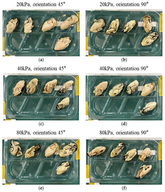 Results of oyster orientation effect: (a) a snapshot of the packaged raw oysters actuation pressure of 20 kPa and oyster orientation of 45°; (b) a snapshot of the packaged raw oysters actuation pressure of 20 kPa and oyster orientation of 90°; (c) a snapshot of the packaged raw oysters actuation pressure of 40 kPa and oyster orientation of 45°; (d) a snapshot of the packaged raw oysters actuation pressure of 40 kPa and oyster orientation of 90°; (e) a snapshot of the packaged raw oysters actuation pressure of 80 kPa and oyster orientation of 45°; (f) a snapshot of the packaged raw oysters actuation pressure of 80 kPa and oyster orientation of 90°.