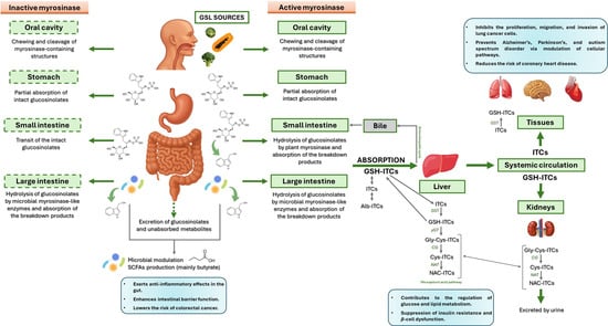 Upon ingestion (Figure 1), mechanical disruption in the oral cavity (e.g., through mastication) leads to the disruption of plant tissue integrity, facilitating the release of endogenous myrosinase. If the vegetables are consumed raw, this enzyme may initiate the hydrolysis of GSL into bioactive compounds such as ITCs. Any intact GSLs that escape hydrolysis in the mouth may undergo limited absorption in the stomach. The remaining GSLs then transit through the gastrointestinal tract to the small intestine, where further hydrolysis may occur in the presence of residual plant myrosinase, with the resulting degradation products being available for absorption. Unhydrolysed GSLs that persist are transported to the colon, where microbial myrosinase-like enzymes activity may mediate additional hydrolysis. The resulting metabolites are subsequently absorbed and/or excreted [].