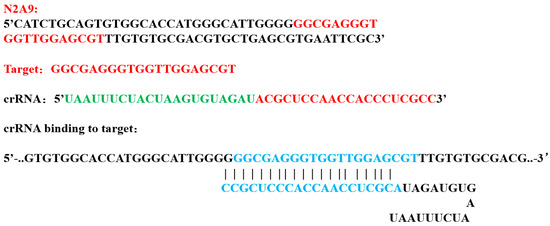 Design of crRNA. For the aptamer N2A9 sequence, using the Benchling platform, high-quality crRNAs complementary to it were designed. The red is target sequence; the green is scaffold sequence; the blue is the binding part of the aptamer target sequence and the crRNA target sequence.