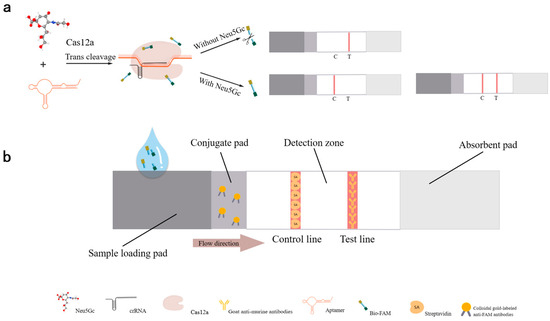 Schematic diagram of a Neu5Gc detection test strip based on Cas12a of aptamer. (a): Detection principle of the Neu5Gc lateral flow test strip based on aptamer-Cas12a. (b): Working principle of the test strip. “Target molecule” refers to Neu5Gc; “Target sequence” refers to the aptamer N2A9.55 recognized by the crRNA; “Reporter” refers to the dual-labeled ssDNA probe; Bio’ stands for biotin, and ‘FAM’ is 6-carboxyfluorescein.