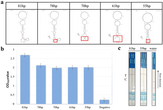 The full-length sequence of an aptamer typically contains redundant bases that serve only to provide unnecessary contact support. These non-essential bases do not interact with the Neu5Gc and may introduce uncertainty in the aptamer structure, thereby destabilizing the binding affinity to the target in the reaction system. The optimization of sequence truncation has the potential to markedly enhance the affinity of nucleic acid aptamers while concurrently reducing the elevated synthetic expense associated with excessively lengthy sequences. A secondary structure analysis of N2A9 reveals comparable energies and analogous specific secondary structure domains, which typically encompass stem-loop structures, G tetrasomes, bulges, or pseudoknots. These domains frequently exhibit binding capabilities with Neu5Gc. Given the stereostructural characteristics of the Neu5Gc molecule, it is plausible that the stem-loop structural domain of the N2A9 aptamer may facilitate direct binding to Neu5Gc. To investigate the specific structural domains of the nucleic acid aptamer and to obtain shortened sequences with high binding affinity, the secondary structure prediction software (mfold3.6 (https://www.unafold.org (accessed on 20 May 2022)) was employed to analyze the N2A9 aptamer, which was truncated to retain the individual loops or combinations of loops at different sites, including hairpin loops, inner loops, and multiple loops. The sequence truncation of the conserved structural stem loop of aptamer N2A9 was optimized, resulting in the production of 78 bp, 70 bp, 61 bp, and 55 bp truncated nucleic acid aptamers (Figure 3a). These were sent to BioCompany for synthesis and labeling with biotin at their 5’ end for indirect competition ELISA for binding effect analysis. As illustrated in Figure 3b, aptamer N2A9.81bp exhibited the highest OD450, the highest binding effect to Neu5Gc, and the highest truncation effect. Figure 3b demonstrates that the aptamer N2A9.81 bp exhibits the highest OD value and the most robust binding effect with Neu5Gc. The truncated nucleic acid aptamers 78 bp, 70 bp, 61 bp, and 55 bp also demonstrate notable binding effects, which substantiates the efficacy of the truncation approach. Upon activation of the Cas12a-crRNA complex by the aptamer, collateral cleavage of the Bio-reporter-FAM occurs, generating a red band at the T line as a visual indication of a positive result. Although FAM is a fluorescent dye, in this study, it was used as an epitope tag for recognition by anti-FAM antibodies. The OD at 450 nm was measured from ELISA plates using TMB substrate, unrelated to FAM fluorescence. These aptamers were subjected to an aptamer-Cas12a test strip reaction, the results of which are presented in Figure 3c. The 81 bp and 55 bp aptamers were cleaved, and the T line displayed a colorful reaction, indicating a positive outcome. Given the comparable affinity and the reduction in sequence, the final selection was N2A9.55bp, which was deemed the optimal choice for the construction of Neu5Gc test strips, offering a cost-effective and time-efficient synthesis process while minimizing the probability of sequence errors.