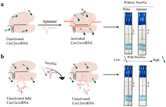 3.2. Proof of Principle Validation of Neu5Gc Lateral Flow Detection Test Strips Based on Aptamer-Cas12a