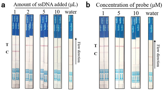 In order to achieve optimal detection performance of aptamer-Cas12a assay test strips, two key parameters, aptamer content and probe concentration, were optimized. In the absence of a target, the optimization process was initiated by removing and equilibrating 100 nM aptamer N2A9.55 bp to room temperature. Subsequently, the aptamer content was varied in four increments (1 μL, 2 μL, 5 μL, and 10 μL) to ascertain the optimal concentration for the assay. Following this, the CRISPR/Cas12a reaction was conducted. The aptamer with different contents was added into the CRISPR system and incubated at 37 °C for 15 min, protected from light. Following incubation, the ep tube was opened, and the end of the binding pad of the test strip (arrow end) was inserted into the reaction tube, ensuring that the liquid level did not exceed the uppermost end of the binding pad. It was essential that the reading area be fully infiltrated and the results be read within 10 min. As illustrated in Figure 5a, when the aptamer content was 5 μL or 10 μL, only the T line exhibited coloration, thereby demonstrating optimal CRISPR system cutting activity. To minimize reagent costs, the subsequent experiments were conducted using an aptamer content of 5 μL.