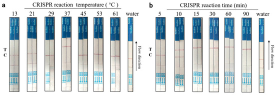 To optimize reaction conditions, we initially excluded Neu5Gc and monitored the cleavage activity of Cas12a under varying temperature and time settings. The principal reaction parameters in the CRISPR/Cas12a-Neu5Gc assay were optimized. It was observed that the Cas12a enzyme is inactivated at temperatures exceeding a certain threshold. To circumvent this issue and ensure the optimal functioning of the enzyme at both high and low temperatures, the reaction temperatures were optimized. The optimal reaction temperatures were selected to achieve rapid and sensitive detection. A total of 5 μL of aptamer (100 nM), 5 μL of 10× Buffer, 5 μL of crRNA (1 μM), 5 μL of Bio-reporter-FAM (5 μM), 5 μL of Cas12a protein (1 μM), and 25 μL of DEPC-treated water were combined at varying temperatures (13 °C, 21 °C, 29 °C, The reaction was conducted at temperatures of 37 °C, 45 °C, 53 °C, and 61 °C for 15 min to prevent light-induced degradation. Subsequently, test strips were introduced to quantify the generated values. By optimizing the temperature, the test strips were recorded. As illustrated in Figure 6a, at a temperature of 37 °C, the T line of the test strip exhibited a color change, indicating the CRISPR system’s cutting effect. In contrast, at other temperatures, the C line of the test strip displayed a color change, suggesting that the CRISPR system did not exert a cutting effect. Therefore, the optimal reaction temperature was determined to be 37 °C.