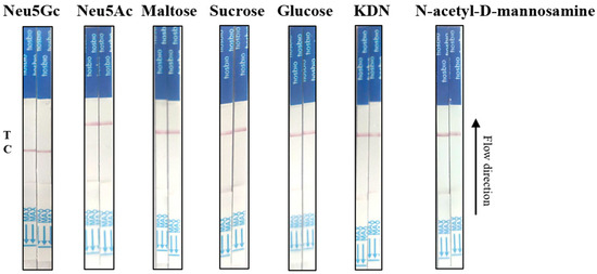 To evaluate the specificity of the aptamer-Cas12a test strips, assays were conducted using 1000 ng/mL of Neu5Ac, KDN (ketodeoxynonanoic acid), N-acetyl-D-mannosamine, maltose, sucrose, and glucose. Firstly, the aptamer was incubated with the Neu5Gc analogues for 10 min at room temperature. Subsequently, the CRISPR/Cas reaction was performed, and finally, the test strips were inserted into EP tubes. The results are presented in Figure 7. At 1000 ng/mL Neu5Gc, the absence of a T line may be due to reduced Cas12a activation resulting from aptamer saturation by Neu5Gc, preventing crRNA binding. Given that Neu5Gc analogues do not bind specifically to the aptamer, the CRISPR system was found to exert trans-cleavage activity, resulting in the cleavage of the probe and the subsequent appearance of the T line, which exhibited a distinct coloration. This indicated that the test strip exhibited good specificity. The results demonstrate that our established method exhibits high specificity for the detection of Neu5Gc and is capable of accurately distinguishing Neu5Gc from other common analogs.
