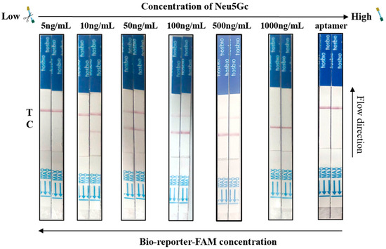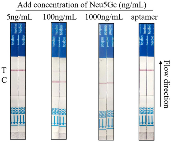 The study employed a series of diluted Neu5Gc standards (5 ng/mL, 10 ng/mL, 50 ng/mL, 100 ng/mL, 500 ng/mL, and 1000 ng/mL) and aptamers (negative control) as samples for test strips. The results are presented in Figure 8. In the assay, the standard concentration of 5 ng/mL or lower was undetectable. Conversely, when the concentration of the Neu5Gc standard was 10 ng/mL or higher, the C line exhibited coloration. When Neu5Gc concentration ranged from 10 ng/mL to 500 ng/mL, both T and C lines were visible. At 1000 ng/mL, only the C line remained. As the concentration of the Neu5Gc standard increased, the color of the C line deepened, and the color of the T line became lighter. At a concentration of 1000 ng/mL, the color of the T line disappeared completely, and only the color of the C line remained. Consequently, when the concentration of Neu5Gc in the sample was below 10 ng/mL, the T line of the test strip exhibited coloration, indicating a negative result. Conversely, when the concentration of Neu5Gc in the sample exceeded 10 ng/mL, the T and C lines of the test strip displayed coloration, or solely the C line displayed coloration, signifying a positive result. The above results indicate that the sensitivity value of this aptamer-Cas12a test strip for the visual detection of Neu5Gc is 10 ng/mL.