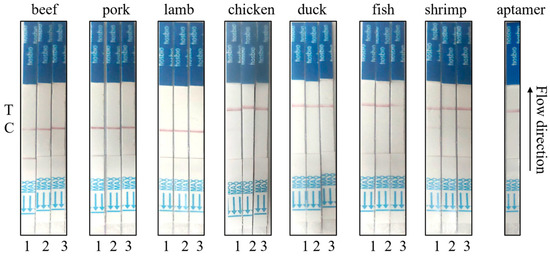 Aptamer-cas12a test strip actual sample determination. The validation process involved the analysis of actual samples, with three portions of pork, beef, and lamb and three portions of chicken, duck, fish, and shrimp meat.