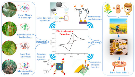 The present review focuses on the detection of four major oilseed crop pathogens: Sclerotinia sclerotiorum; Phakopsora pachyrhizi (soybean rust); Sclerotium rolfsii; and Hyaloperonospora parasitica (downy mildew) have been identified as the causative agents affecting peanuts; soybeans; and rapeseed. The methodology employed is a systematic analysis of electrochemical biosensor platforms developed for the detection of target substances associated with diseases caused by these pathogens. The inclusion criteria stipulate that: The following three criteria must be met for a detection method to be considered suitable: