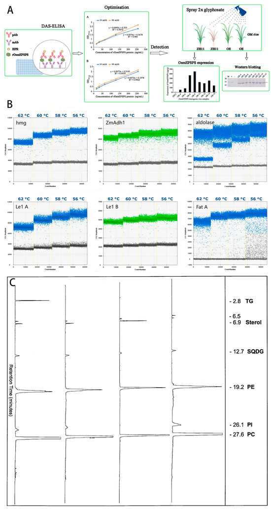 (A) OsmEPSPS protein quantification method using double antibody sandwich quantitative ELISA (Ref. [37]. 2025, Luo Biao.); (B) emperature gradient ddPCR results for the different taxon-specific assays (Ref. [38]. 2018, Sara Jacchia.); (C) HPLC separation and fractionation of the polar lipid extracts derived from different Brassica napus L (Ref. [39]. 2003, Chris-topher Beermann.).