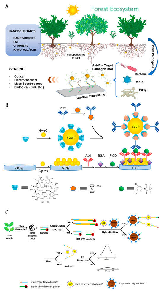 (A) SSchematic presentation nanomaterial pollution and use of nanomaterial for plant pathogen detection (Ref. [42]. 2022, Prabir Kumar Kulabhusan.); (B) Schematic illustration of the fabrication process of the immunosensor (Ref. [44]. 2025, Qiushuang Ai.); (C) Schematic illustration of the electrochemical bioassay for plant pathogen DNA detection (Ref. [43]. 2016, HanYih Lau.).