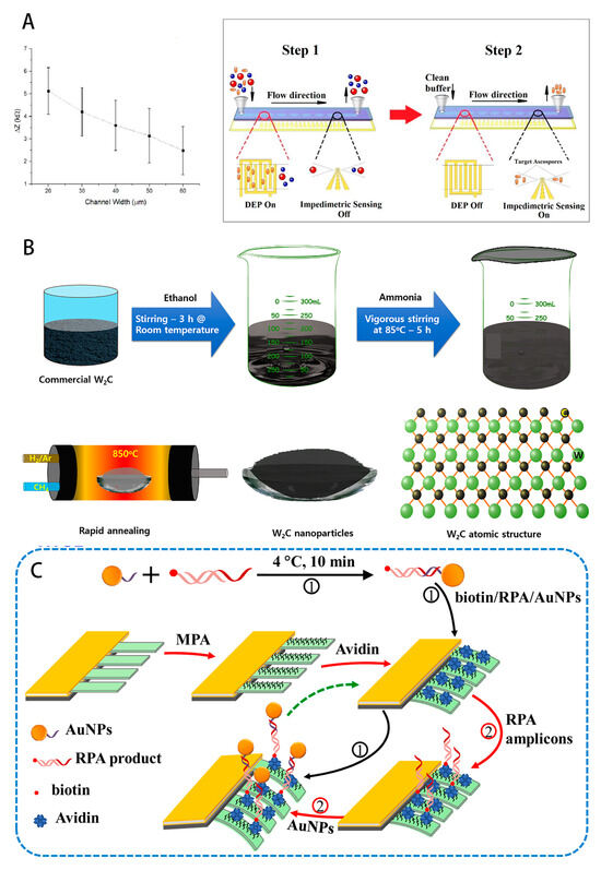 (A) Microfluidic microarray device that can be used to measure the impedance change caused by single S. sclerotiorum ascospores (Ref. [51]. 2020, Pedro A.); (B) Detection of oxalic acid by molecularly imprinted electrochemical sensor based on tungsten carbide (W2C) nanoparticles (Ref. [50]. 2020, Sajjad Hussain.); (C) Dynamic Microcantilever- Recombinase Polymerase Amplification assay Detection of traces of Lactobacillus flavus genomic DNA in oilseed rape genomic DNA (Ref. [47]. 2021, Rong Lei.).