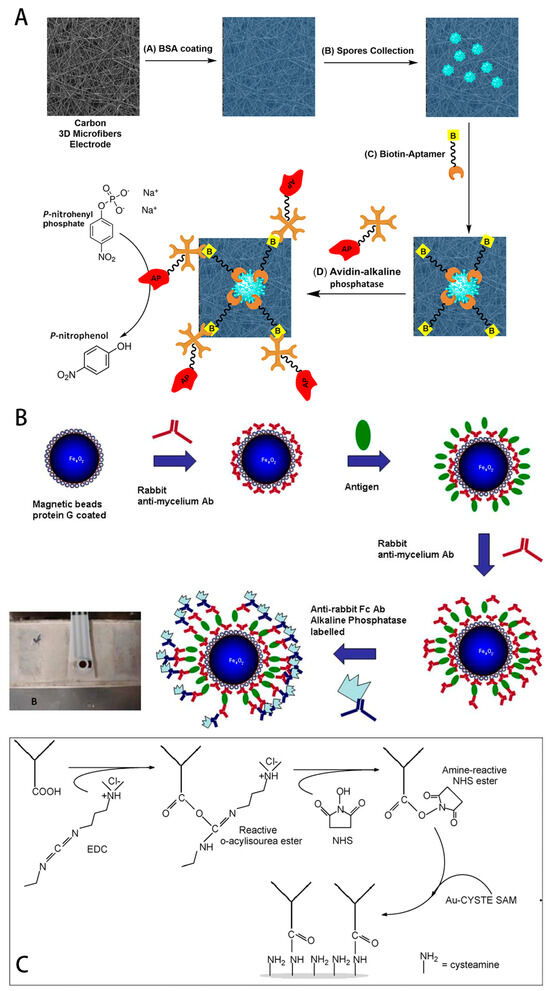 A group of researchers from the Catholic University of Campinas developed a disposable voltammetric immunosensor based on magnetic beads, using DPV electrochemical methods for the early diagnosis of soybean rust. The sensor uses antibodies specific to soybean rust mycelium [53]. The antibody is immobilised on magnetic beads via the Fc portion of the antibody and modified with protein G. The antibody is used for the diagnosis of soybean rust. Due to the high specificity of antibody antigen recognition, this sensor has excellent anti-interference and selectivity, and does not even produce a DPV current peak for non-target detection objects. The immunoassay is performed by sandwich method using a secondary antibody labelled with phosphatase. Also for immunosensors, a team of researchers at the Institute of Chemistry, State University of Campinas has developed a self-assembled monolayer surface plasmon resonance immunosensor [54]. The antibody anti-Phakopsora pachyrhizi (pathogen) was covalently immobilized on a gold substrate via a self-assembled monolayer (SAM) of thiols using cysteamine-coupling chemistry. The sensor prepared in this way presented a linear response range for the antigen from 3.5 to 28.0 g mL−1 (r2 = 0.996). In addition, other research teams have made different attempts in electrochemical detection of soybean rust, for example, Vadim Krivitsky et al. designed an aptamer-based highly selective electrochemical sensor capable of capturing airborne ascomycetous spores [55], and this design not only produces a detection result in less than two minutes, but also has the ability to capture spores at a rate of 100~200 spores per square centimetre of electrode area. Compared with other non-specific spore types, these sensors display distinct and sharp peaks in the peak current of the target detection object, proving that these sensors have clear selectivity and excellent anti-interference properties. Here is Figure 5.