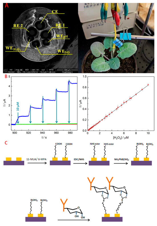 (A) Minimally invasive electrochemical microtubule bundles for simultaneous detection of H2O2,NO and pH changes in plants (Ref. [59]. 2015, Qiong-Qiong Ren.); (B) Non-enzymatic screen-printed sensor based on PtNPs@polyazure A for H2O2 detection (Ref. [41]. 2020, R Jiménez-Pérez.); (C) Immuno-impedimetric biosensor forecasting of Sclerotinia Stem Rot of Canola (Ref. [52]. 2018, LianC.T. Shoute.).