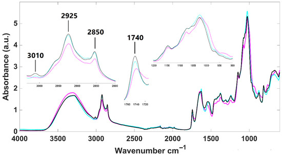 FTIR analyses of H. pluvialis and P. cruentum highlighted biochemical modifications associated with growth phases and fermentation. In H. pluvialis, the aplanospore stage exhibited higher lipid and carotenoid content than the palmella stage, as evidenced by increased absorption at 2925, 2850, and 3010 cm−1. The 1740 cm−1 band, characteristic of astaxanthin, was more pronounced in aplanospore samples, corroborating carotenoid accumulation during maturation.