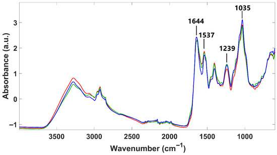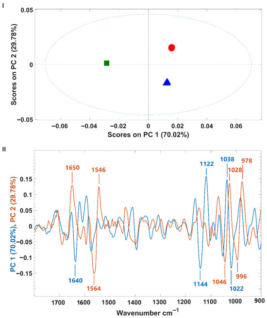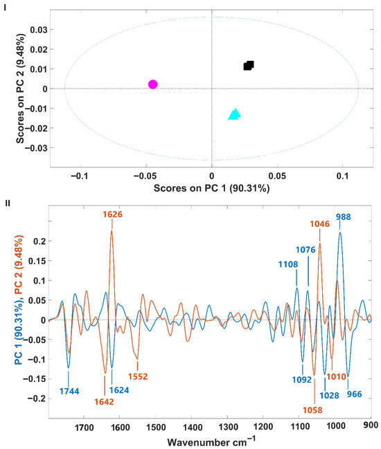 Spectral PCA confirmed distinct clustering of palmella, aplanospore, and fermented aplanospore samples. The carbohydrate absorption region (1200–900 cm−1) was decisive in PC1-based separation (palmella vs. aplanospore), consistent with known shifts in carbohydrate composition from cellulose to mannose during differentiation. PC2 loadings, particularly at 1626 and 1046 cm−1, differentiated fermented samples, suggesting rearrangements in protein and sugar structures due to microbial activity.