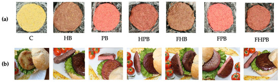 Fermentation and the incorporation of microalgal biomass caused notable changes in the color profile of the vegan burger formulations. The control burger (C) had the highest lightness and hue angle near 77°, corresponding to a golden-beige appearance. In contrast, burgers containing fermented microalgae, particularly P. cruentum, appeared darker, redder, and more chromatically saturated. These color modifications diverged from those observed in the isolated microalgal biomasses, highlighting the influence of matrix interactions, heat application, and food processing on pigment behavior and expression. From a sensory perspective, these color changes may influence consumer perception in both positive and negative ways. Redder hues may enhance the perceived similarity to traditional meat products, whereas darker tones could be misinterpreted as signs of overcooking or artificial additives. Thus, optimizing the visual attributes is crucial in product development.