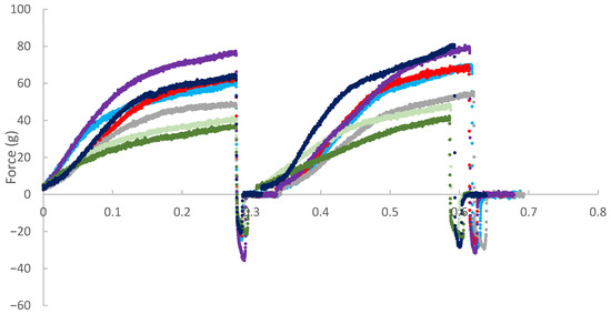 P. cruentum (P and FP) exhibited lower hardness and an early onset of structural failure (evident from partial load drop at approximately 0.1 min), indicating reduced mechanical integrity. This observation may be associated with the presence of unstructured liquid components in