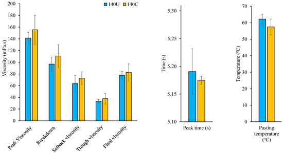 Pasting properties of flours with (140U) and without (140C) undried house crickets both extruded at 140 °C (n = 3). The error bars indicate standard deviations. Statistical differences were not observed based on p ≤ 0.05.