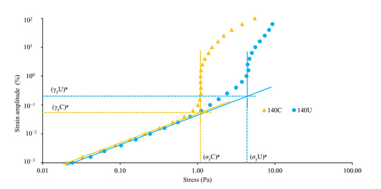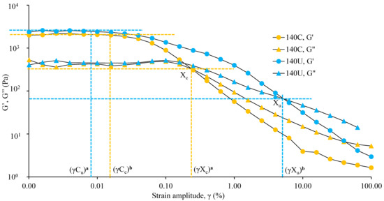 The studied flours displayed flow curves with well-defined linear regimes at low shear strain amplitude followed by strain-thinning properties, as expected for a paste consisting of a jammed system of particles. The linear visco-elastic region (LVE) was evidenced by constant G′ and G″ values until the critical strain (γc) was achieved, measured at ≈0.01 and ≈0.03% for 140U and 140C, respectively. The critical strain (γc, the point at which the change in G′ exceeds 5%) represents a counterbalance between maintaining gel structural integrity and shear deformation of the sample [68,69]. The lower critical strain (≈0.01%) of 140U compared to 140C (≈0.03%) suggests that the paste with crickets started to soften sooner, however without becoming fragile.