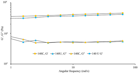 Visco-elastic moduli (elastic/storage modulus, G′, and viscous/loss modulus, G″) as a function of angular frequency, rad/s, for porridges containing undried house crickets (140U) and the control without house crickets (140C) (n = 3).