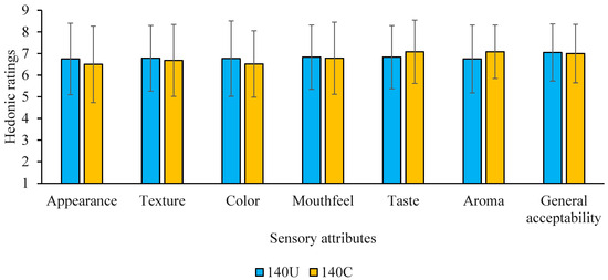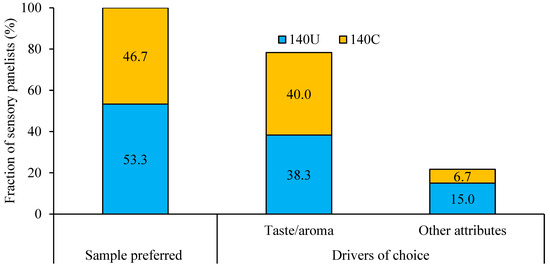 As for unsaturated aldehydes, only the peak area of 4-heptenal was significantly higher in 140U than 140C (p < 0.01). Although the odor detection threshold of 4-heptenal is 0.025 µg/L water [23], it is uncertain whether 4-heptenal could have had an impact on the overall aroma of the products due to the relatively low peak area.