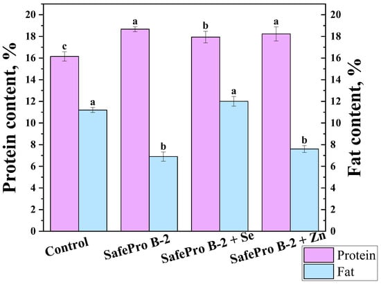 The mass fraction of protein in all experimental samples remained at a stable, high level. The highest value was observed in the SafePro B-2 sample (18.67 ± 2.80%), indicating the preservation and even possible activation of the protein structure with the participation of the probiotic culture (Figure 1). Castellano et al. [37] investigated the ability of L. sakei to hydrolyze sarcoplasmic and myofibrillar proteins in meat systems. They found that L. sakei efficiently cleaves proteins to form peptides and amino acids, which can improve the sensory characteristics of products.