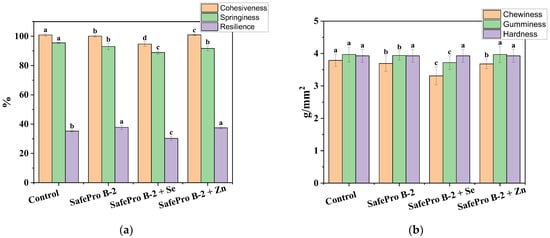 Structural and mechanical properties of the test samples: (a) cohesiveness, springiness, and resilience; (b) chewiness, gumminess, and hardness; control was a restructured product without L. Sakei and essential trace elements; letters (a–d) represent significant differences at p < 0.05.