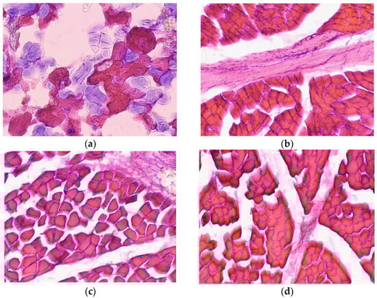 - Khvylya, S.I.; Pchelkina, V.A.; Burlakova, S.S. Standardized histological methods for assessing the quality of meat and meat products. Vsyo o Myase 2011, 6, 32–35. [Google Scholar]
