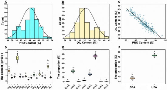 Descriptive analysis of nutritional quality of 259 upland cotton accessions. Frequency distribution of protein content (A) and oil content (B) in cottonseeds. Correlation analysis of protein content and oil content in cottonseeds (C). Multiple comparisons of amino acid content (D), fatty acid proportion (E), and proportion of saturated and unsaturated fatty acids (F) in cottonseeds. Different lowercase letters indicate significant differences at the p < 0.05 level. EAAs: Essential amino acids, NAAs: non-essential amino acids, Asp: Aspartic Acid, Thr: Threonine, Ser: Serine, Glu: Glutamic Acid, Gly: Glycine, Ala: Alanine, Val: Valine, Met: Methionine, Ile: Isoleucine, Leu: Leucine, Tyr: Tyrosine, Phe: Phenylalanine, Lys: Lysine, His: Histidine, Arg: Arginine, Pro: Proline, PRO: Protein, C14:0: Myristic Acid, C16:0: Palmitic Acid, C16:1: Palmitoleic Acid, C18:0: Stearic Acid, C18:1: Oleic Acid, C18:2: Linoleic Acid, C18:3: α-Linolenic Acid, C20:0: Arachidic Acid, UFA: Unsaturated fatty acids, SFAs: Saturated fatty acids.