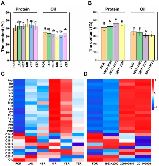 Analysis of nutritional quality differences in 259 upland cotton accessions by geographical sources and breeding period. Multiple comparisons of protein content and oil content in cottonseeds from different geographical origins (A) and different breeding periods (B). Heatmap of 26 cottonseed nutritional quality traits by geographical origins (C) and breeding period (D). Red indicates high content; blue indicates low content. Intensity reflects magnitude. Different lowercase letters indicate significant differences at the p < 0.05 level. YZR: Yangtze River Basin, YZR: Yellow River Basin, NER: northern extra-early-maturing cotton region, NIR: northwest inland region, LAN: landraces, FOR: foreign.