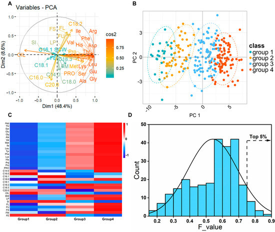 Basic statistical analysis was conducted using IBM SPSS Statistics 25 (IBM, Armonk, NY, USA). Describe the distribution characteristics of all traits using descriptive statistics (mean ± standard deviation). A one-way analysis of variance (ANOVA) combined with Tukey’s post hoc test was employed to determine the significance of differences between groups (p < 0.05). Calculate the Pearson correlation coefficient matrix to explore relationships among cottonseed nutritional qualities and fiber traits. Perform PCA using the factoextra package in R Studio (version 4.2.1). Basic visualizations, including histograms and box plots, were created using OriginPro 2022 (Originlab Corporation, Northampton, MA, USA).