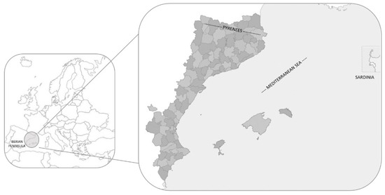 The Catalan linguistic area (CLA), also known as the Catalan-speaking area, Catalan-language territories, or Catalan Countries, is located in the eastern section of the Iberian Peninsula, the Balearic Islands, a portion of the northern Pyrenees and the city of Alghero (Sardinia); Figure 1 [27]. These territories are spread across four countries: all of Andorra; part of south-east France (Northern Catalonia or the Eastern Pyrenees department); a city in Italy (Alghero in Sardinia); and several regions in Spain, including the Balearic Islands, Carxe (a small area in Murcia), Catalonia, a portion of eastern Aragon, and Valencia [28].