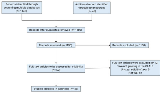Regarding the first search, after duplicates were removed, a total of 1195 references of articles and books were identified from searches of academic and specialized databases, library catalogues and archives, and expert consultation. Based on the title of the references, 1138 were excluded at the initial stage, with 57 full text sources to be retrieved and assessed for eligibility. Of these, twelve were excluded for the following reasons: five reported edible macromycetes not growing in the CLA, five lacked sufficient edibility data or identifiable taxa, and two did not contain WEF. The remaining 45 studies were considered eligible to elaborate a corpus of WEF in the CLA. Figure 2 provides a schematic overview of source selection from the first search.