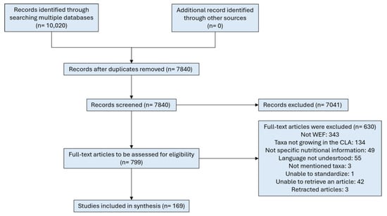 Once the first search had been completed and analysed, a second was carried out to find which WEF from the CLA have nutritional values published. After duplicates were removed, a total of 7840 articles were identified from multiple databases. Based on the title of the references, 7041 were excluded at the initial stage, including reviews, with 799 full-text sources to be retrieved and assessed for eligibility. Of these, 630 were excluded for the following reasons: 343 did not contain WEF data, 134 reported edible macromycetes not growing in the CLA, 49 did not indicate nutritional values, 55 were written in languages neither familiar to the authors nor corresponding to their native language, 3 articles were excluded due to our inability to assign taxa, and 1 article did not have sufficient data to standardize the results in our data-charting method. Finally, 42 studies were excluded because we were unable to retrieve them and 3 articles were retracted, resulting in a final selection of 169 articles eligible for this review. Figure 3 provides a schematic overview of source selection from the second search.