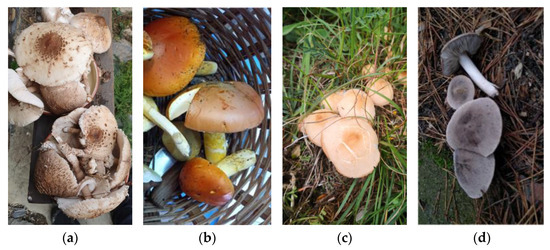 Four of the most cited wild edible fungi (WEF) in the Catalan linguistic area (CLA): (a) Macrolepiota procera collected in the forest; (b) Amanita caesarea in a traditional basket; (c) Marasmius oreades in meadows; (d) Tricholoma terreum in the forest.