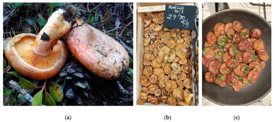 Wild edible fungi (WEF) of the Lactarius sect. Deliciosi ethnotaxon, which includes two of the main macromycetes cited in the Catalan linguistic area (CLA), Lactarius sanguifluus and Lactarius deliciosus: (a) Lactarius deliciosus in the forest. (b) “Rovellons” sold at a market in Vilafant (Alt Empordà), harvested in Catalonia. (c) Cooking “rovellons” traditionally with “all i julivert” [garlic (Allium sativum) and parsley (Petroselinum crispum)].